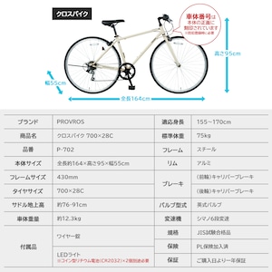![[完成車発送] クロスバイク 自転車 700×28C シマノ6段変速 ギア ワイヤー錠・LEDライト付き ギフト プレゼント クイックレリーズ スポーツ 通勤通学 街乗り 組立整備済 点検済 完成品 PROVROS プロブロス P-702](https://baseec-img-mng.akamaized.net/images/item/origin/a90f60844ad5975b7aece37523066fda.jpg?imformat=generic)