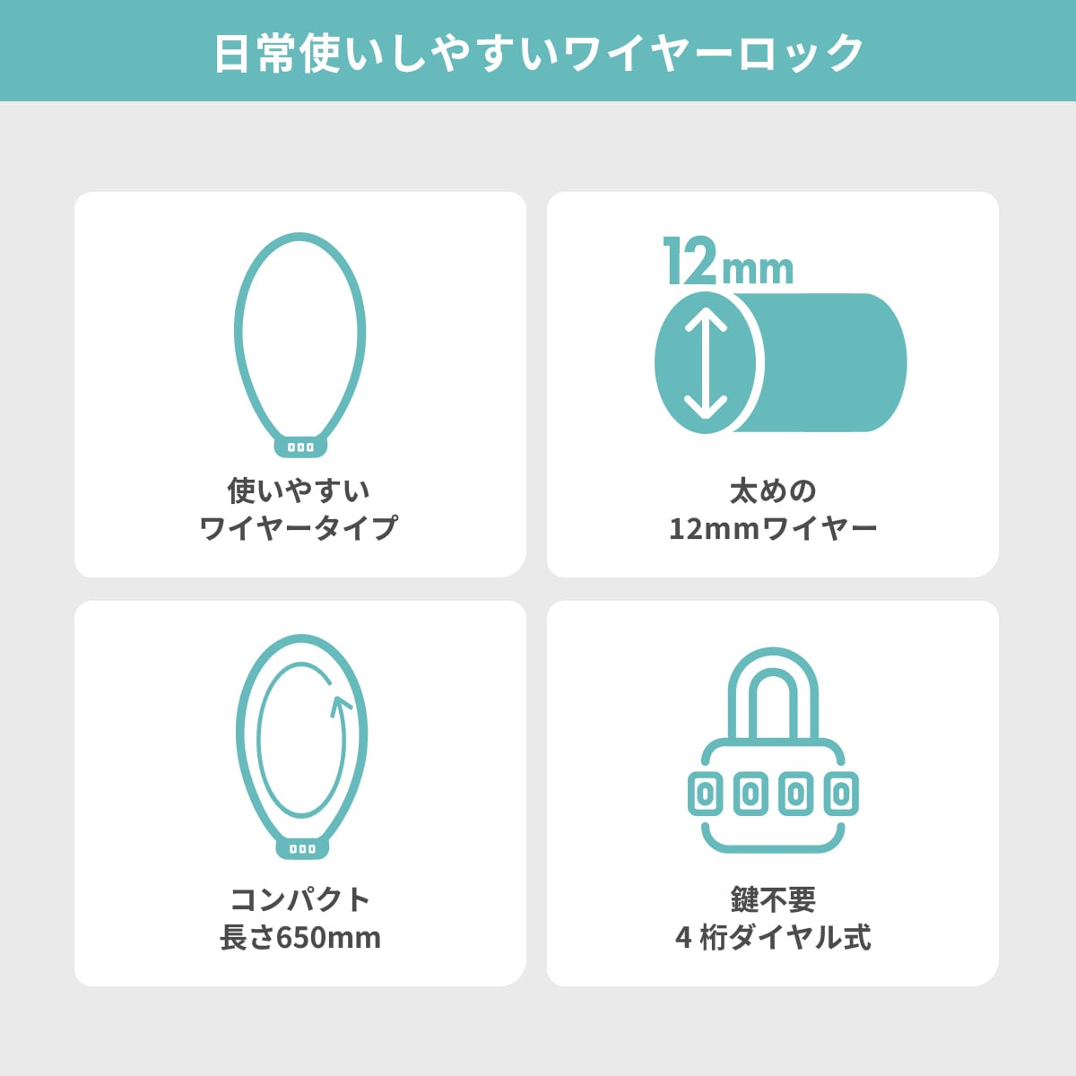 ワイヤーロックは8~10mmのワイヤー径が多い中、太めの12mmワイヤーを採用。軽量ながらも切断に強く、盗難をしっかり防止。