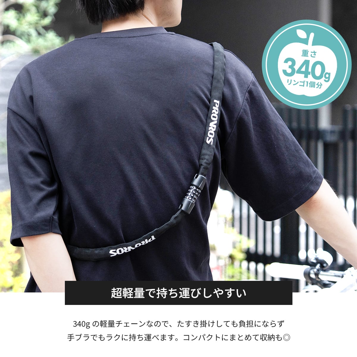 頑丈で耐久性の高いチェーンロックで、直径3.5mmのスチールチェーンと耐摩耗性ナイロンカバーにより自転車を傷から守ります。4桁の暗証番号式で鍵不要、10,000通りの組み合わせで安心。1200mmのロングチェーンは地球ロックや複数台の施錠にも便利で、340gと軽量です。使わないときはコンパクトにまとめられ、たすき掛けも可能な長さで持ち運びも簡単です。