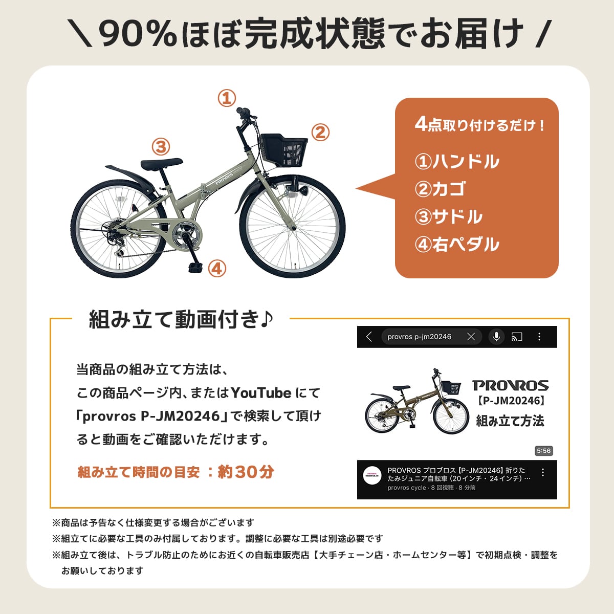 PROVROS ジュニア マウンテンバイク 折りたたみ自転車 20インチ 24インチ 自転車 シマノ6段変速 ギア 子供用 MTB 折り畳み カゴ・LEDライト・ワイヤー錠付き プロブロス【メーカー保証1年】 P-JM20246