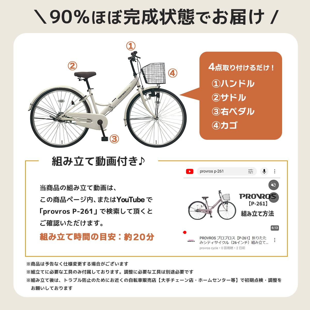 シティサイクル 折りたたみ自転車 26インチ ジュニア シングルギア カゴ カギ ライト付き ママチャリ シティバイク メーカー1年保証 P-261